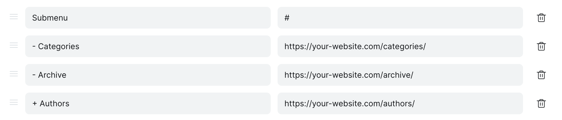 2. **Create a New Menu Item**: Add a new item to your primary navigation that will serve as the parent menu. Insert # into the link field. It should look like this:&#x20;